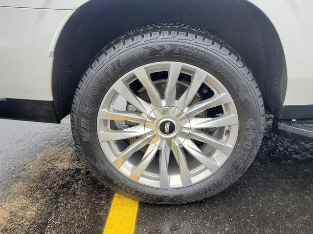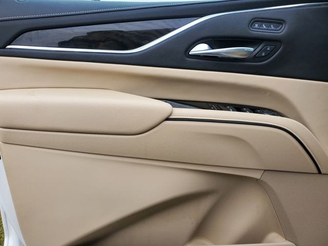 The Escalade ESV Premium's exterior is equally impressive, featuring a striking Crystal White Tricoat paint finish and stylish 22" alloy wheels. The power liftgate, puddle lamps with the Cadillac crest, and running board assist steps add both form and function to this exceptional vehicle.