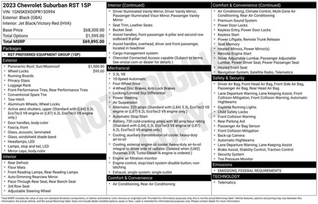Fox Chevrolet has been delivering on a promise since 1967. Come in and check out what the Fox Advantage truly is. Same Vehicle, Same Color, Same Options- Better Value. We do the legwork for you! We use state-of-the-art software to make sure our vehicles are priced below the market. This ensures you a great value, a stress-free and fun buying experience. As part of the Fox family, all of our customers receive a Deductible Reimbursement program that could save you thousands, just ask us how! 4WD 2023 Chevrolet Suburban RST EcoTec3 5.3L V8