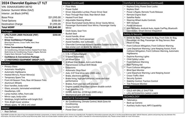 Conquer the roads with confidence, thanks to the Equinox LT's capable 1.5L DOHC engine and all-wheel-drive system. With an EPA-estimated 24 city/30 highway MPG, you'll experience the perfect balance of power and efficiency.